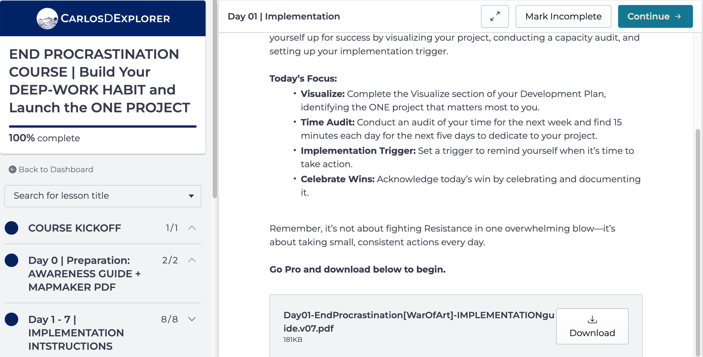 I know exactly how that feels.Sup champ, I’m Carlos Daniel García, or also known as Carlos D Explorer.I studied finance and broke into Wall Street working as an investment banker, where structure, deadlines, and accountability were built into every day. Procrastination? It wasn’t even on my radar. But when I left that world to follow my true calling and became an entrepreneur, everything changed. Without the structure, I found myself stuck—delaying the important things, waiting for the ‘perfect moment,’ and pushing off what really mattered.I launched an Amazon publishing business, hoping it would be another breakthrough. But perfectionism crept in. I spent so much time procrastinating on the launches, trying to get every tiny detail just right, that by the time I was finally ready, Amazon changed their terms and conditions. All that hard work? It didn’t stand a chance.That’s when I knew something had to change. I moved to Bali, chasing a life of impact, adventure, and purpose. But even here, in paradise, I kept running into the same roadblocks—procrastination and perfectionism were still holding me back from the projects that I was most passionate about.Recently, I took a personal retreat deep in nature—just me, the ocean, and Source. And from that space of clarity, I created a system that helped me finally break free from procrastination. It’s a system that focuses on building deep work habits and launching the projects that matter most to you.And that’s what I’m sharing with you in this course. In just 7 days, we’ll work together to break through the Resistance that’s been holding you back, and I’ll show you how to create the systems you need to finally bring your project to life.I’m on this journey with you—this is something I’ve struggled with too, but there is a way forward.